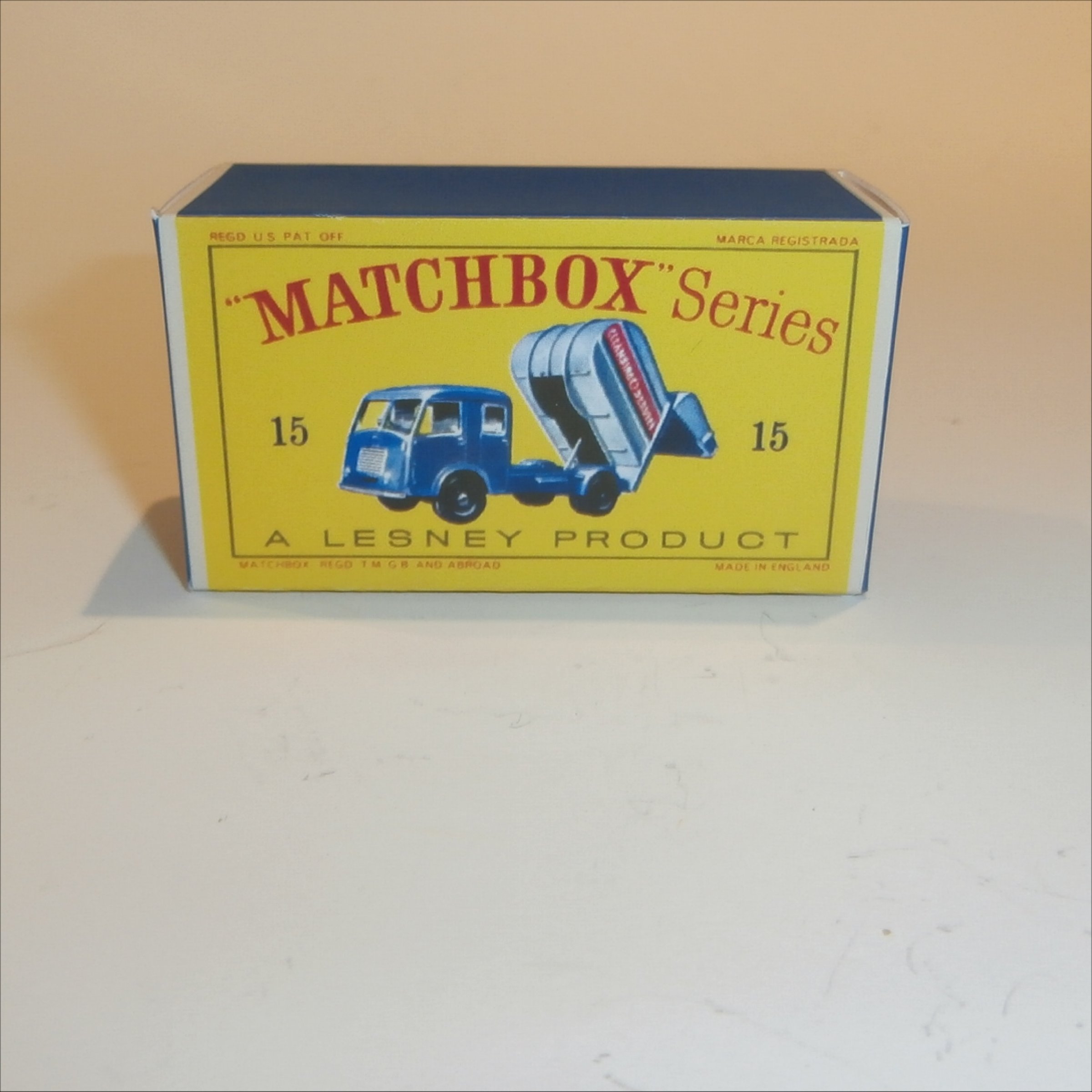 An empty reproduction Matchbox Lesney 15 c Dennis Refuse Truck Empty D Style Repro Box.