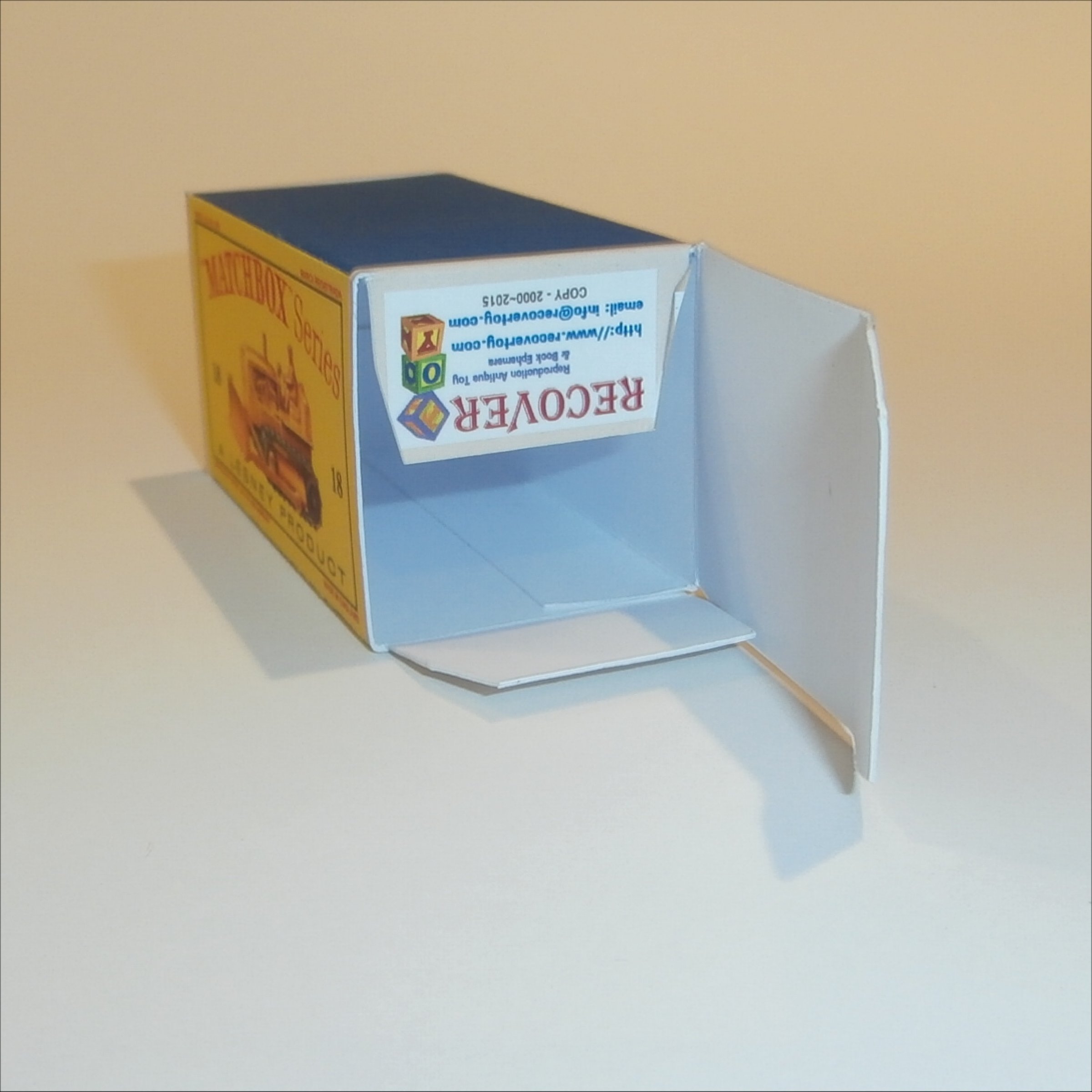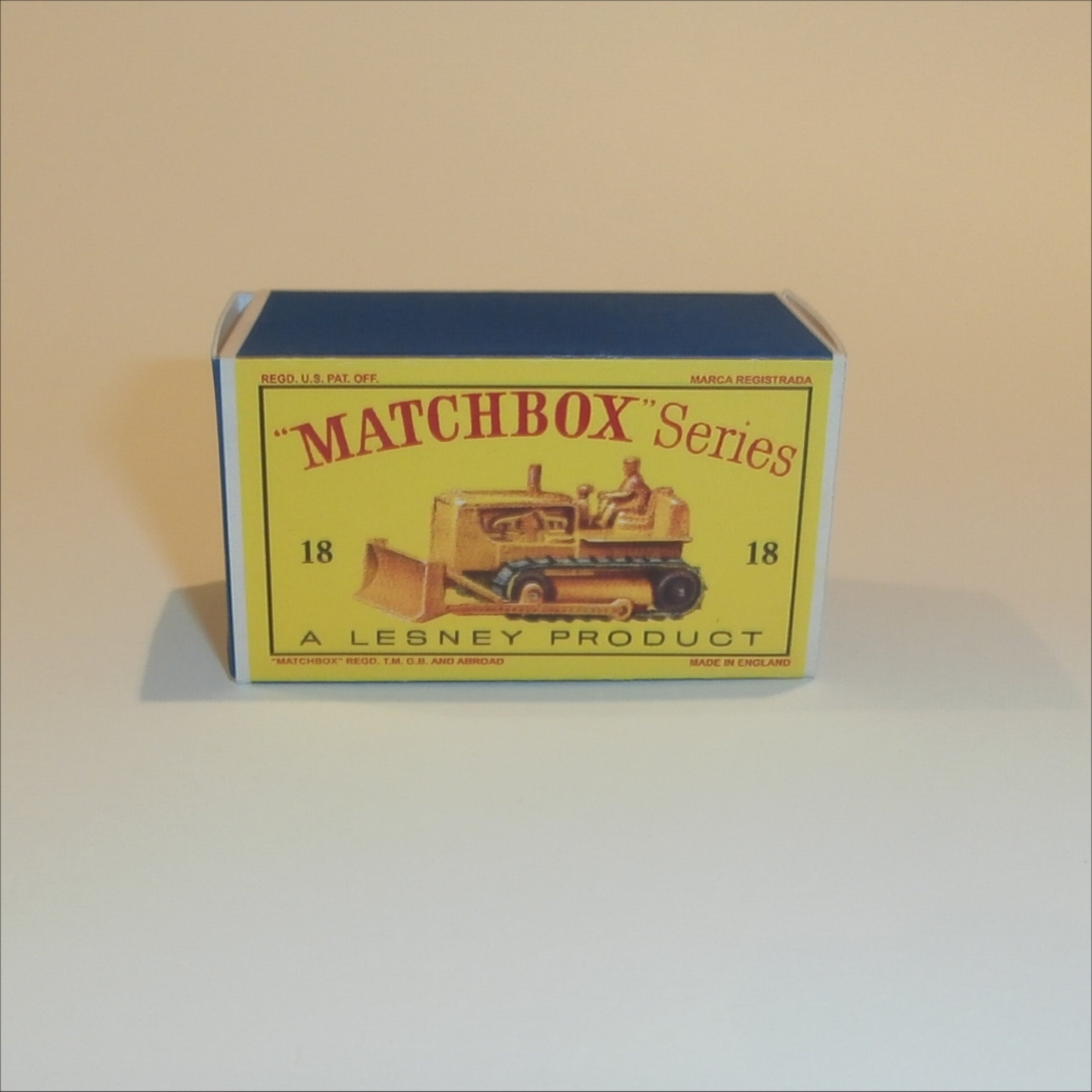 This Matchbox Lesney D style reproduction box is for the 18c Caterpillar Bulldozer. Suits the larger size model. The earlier smaller 18b has the b or c style box.