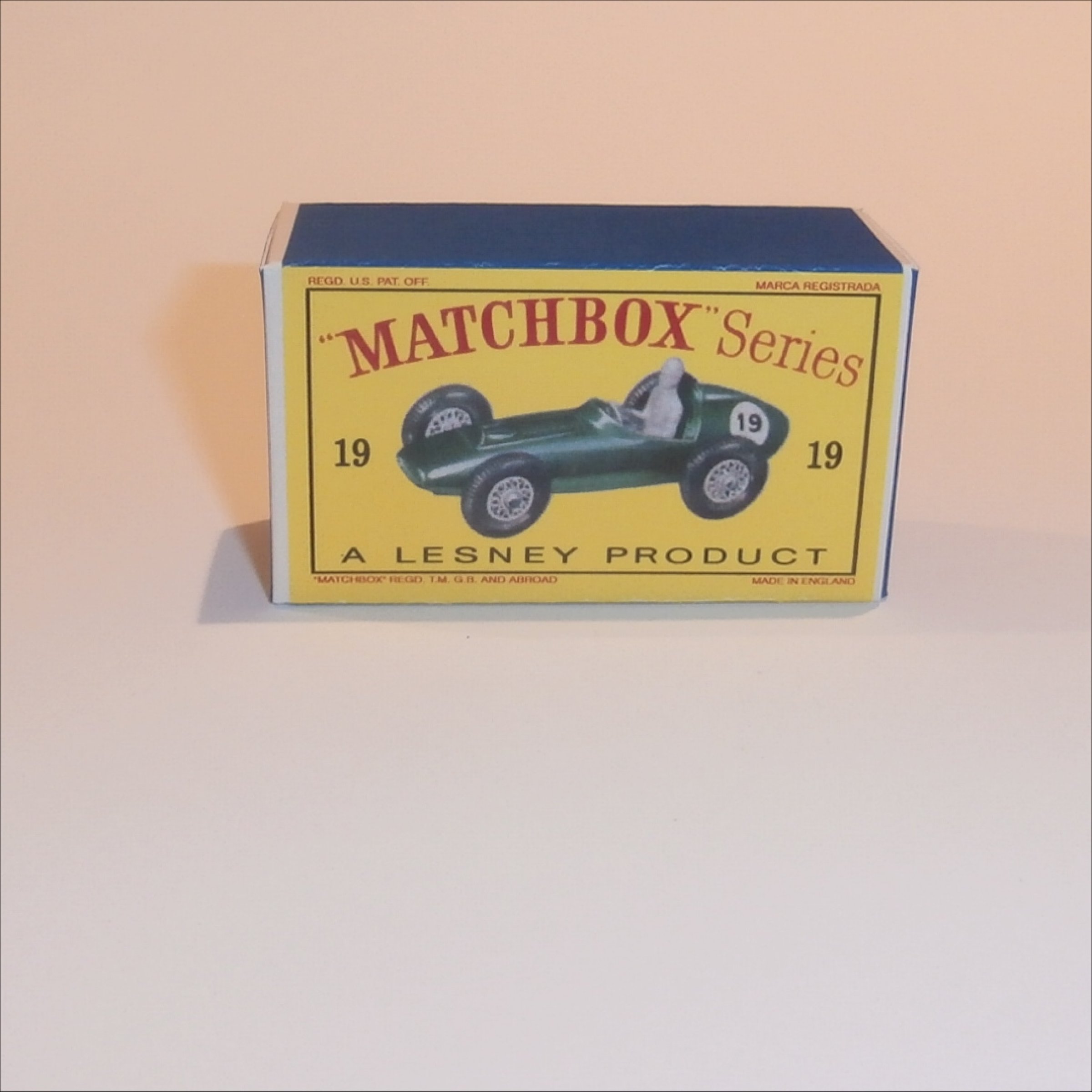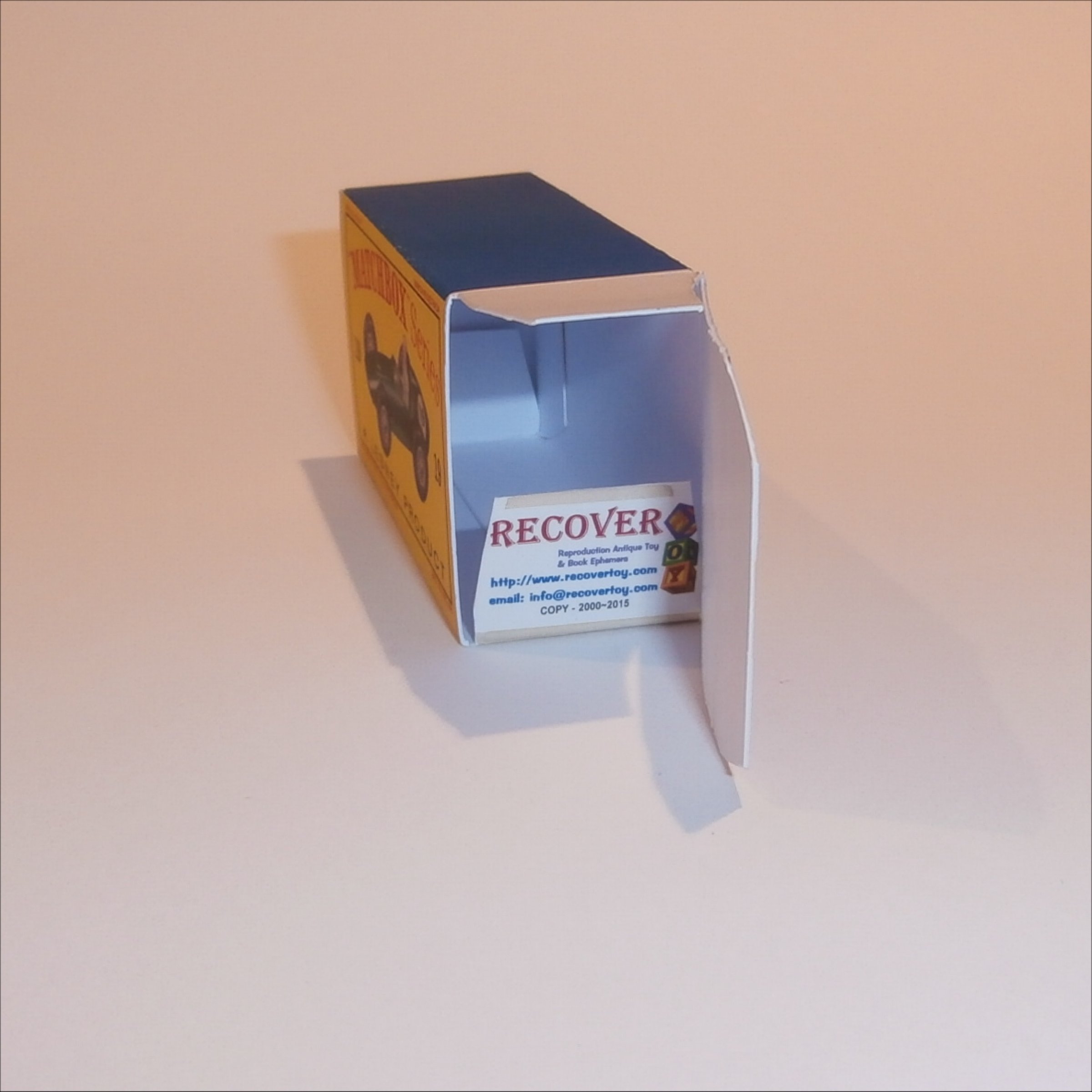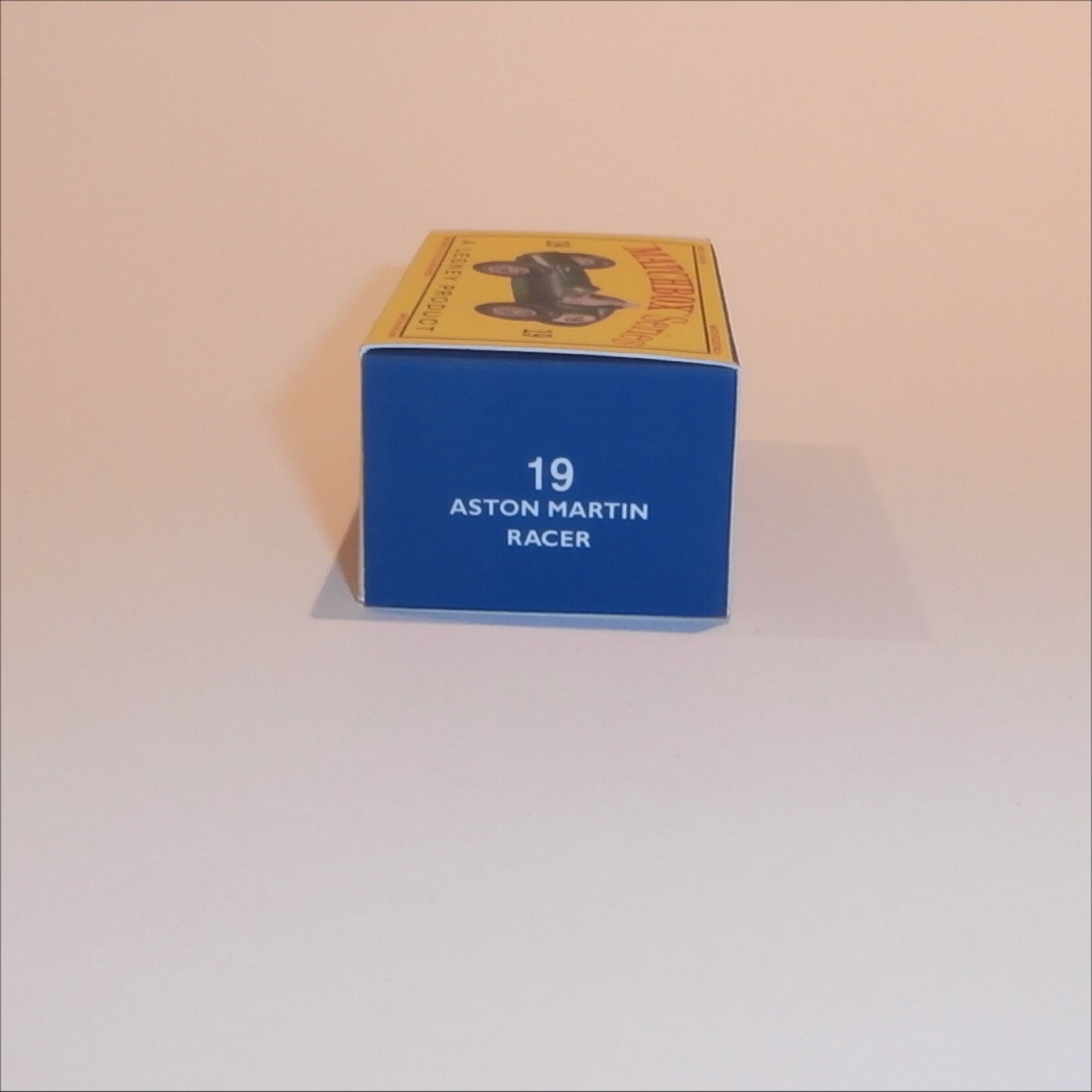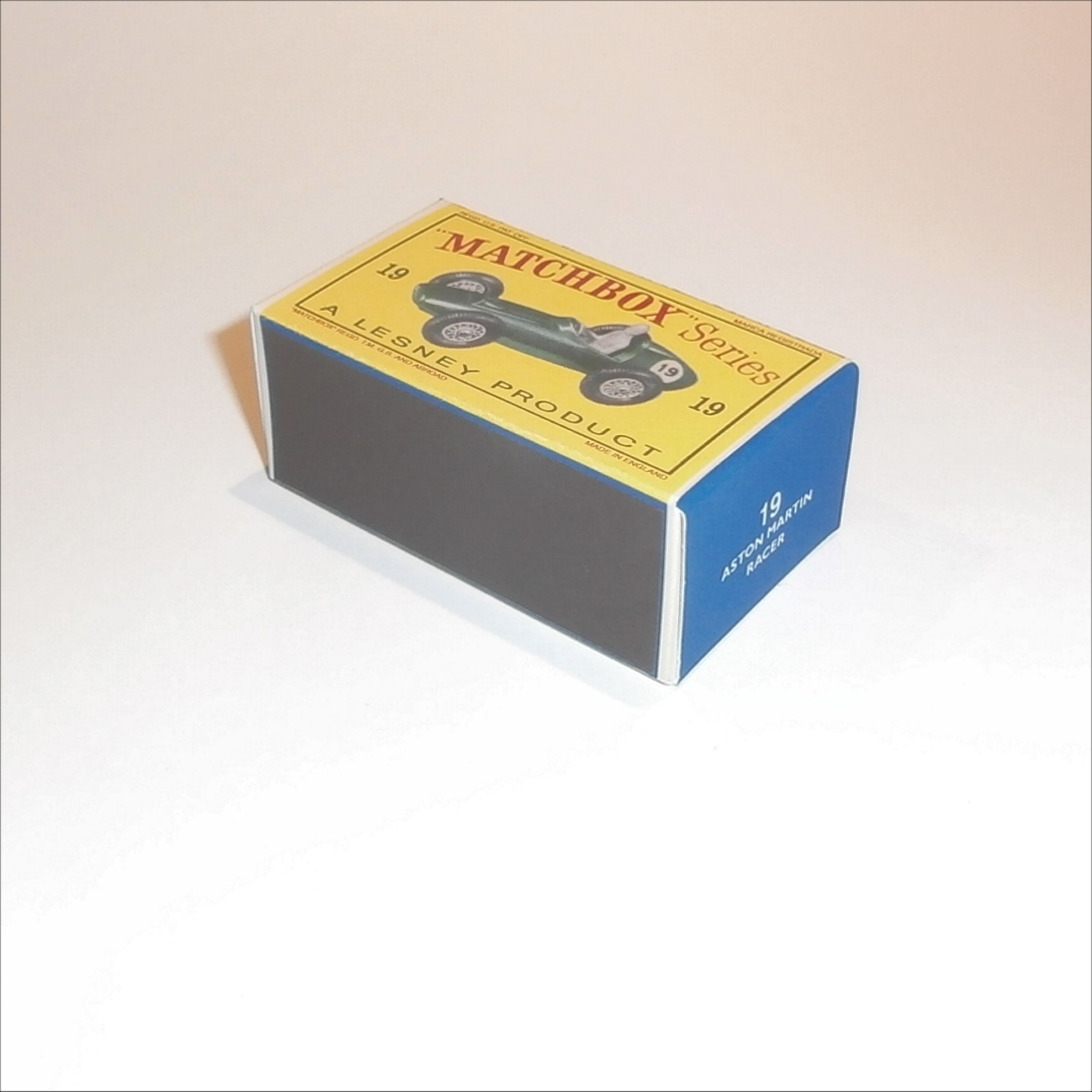 An empty reproduction Matchbox Lesney 19 c Aston Martin Racing Car Empty D Style Repro Box.