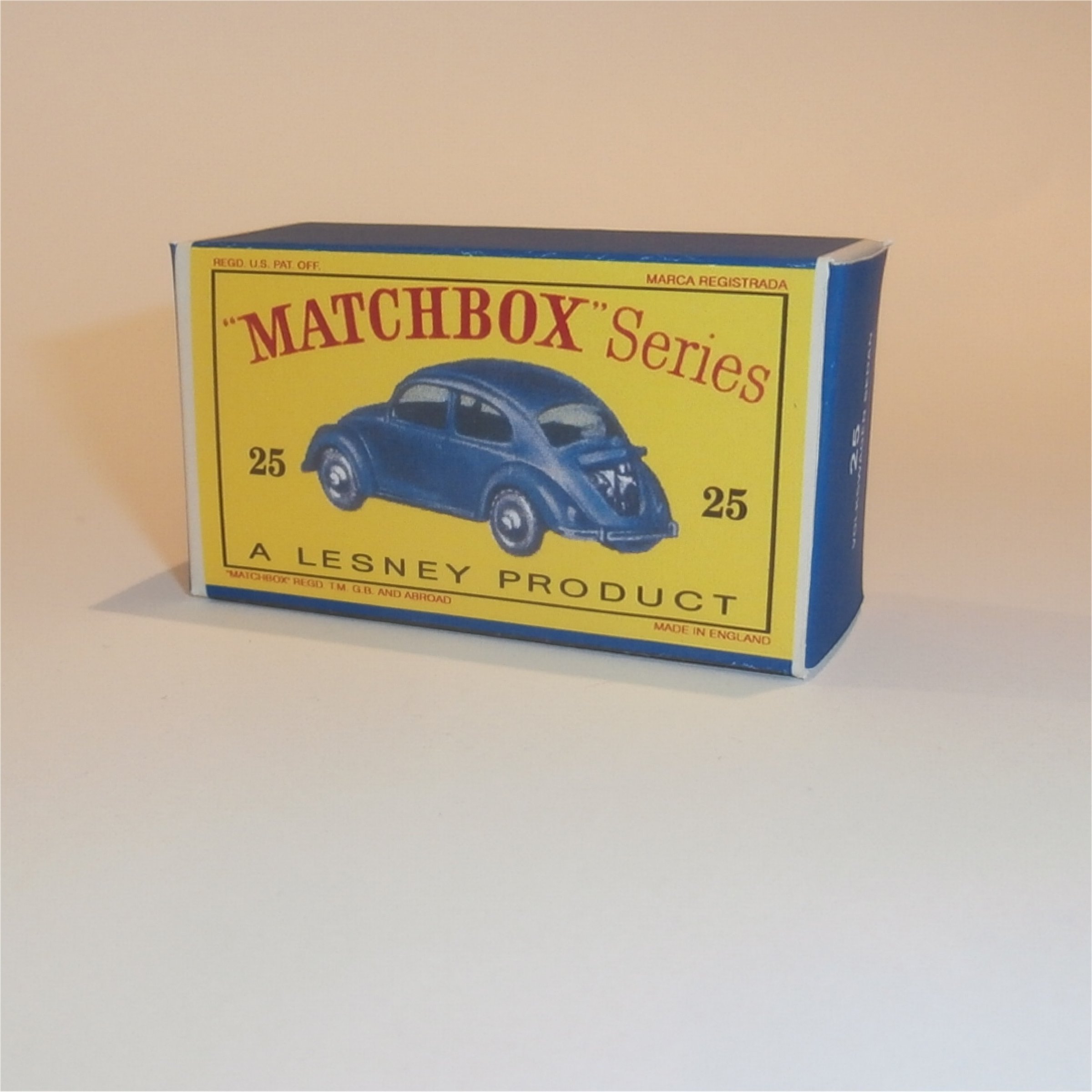 An empty reproduction Matchbox Lesney 25 b VW 1200 Sedan Empty D Style Repro Box.