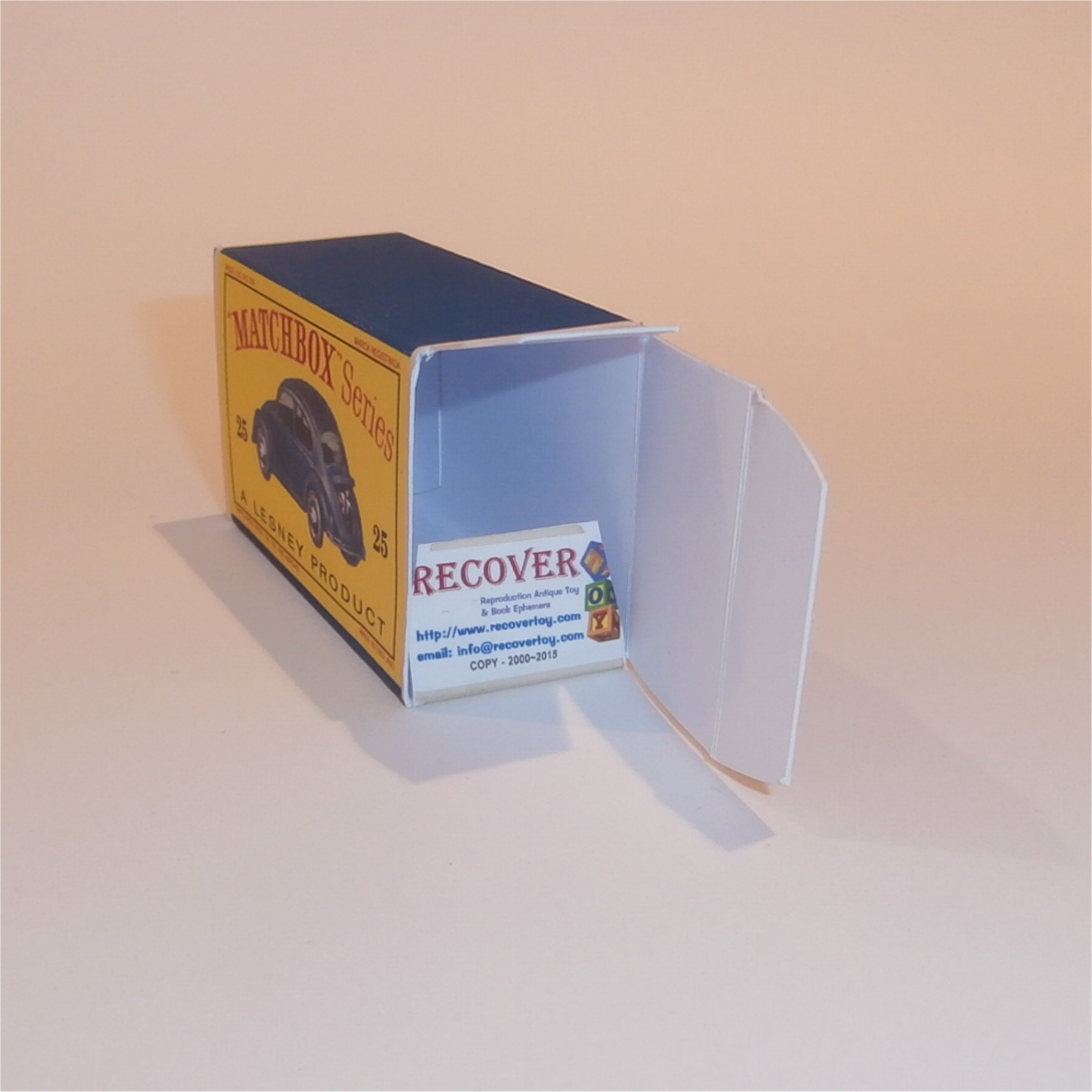 An empty reproduction Matchbox Lesney 25 b Volkswagen VW 1200 Sedan Empty D Style Repro Box.