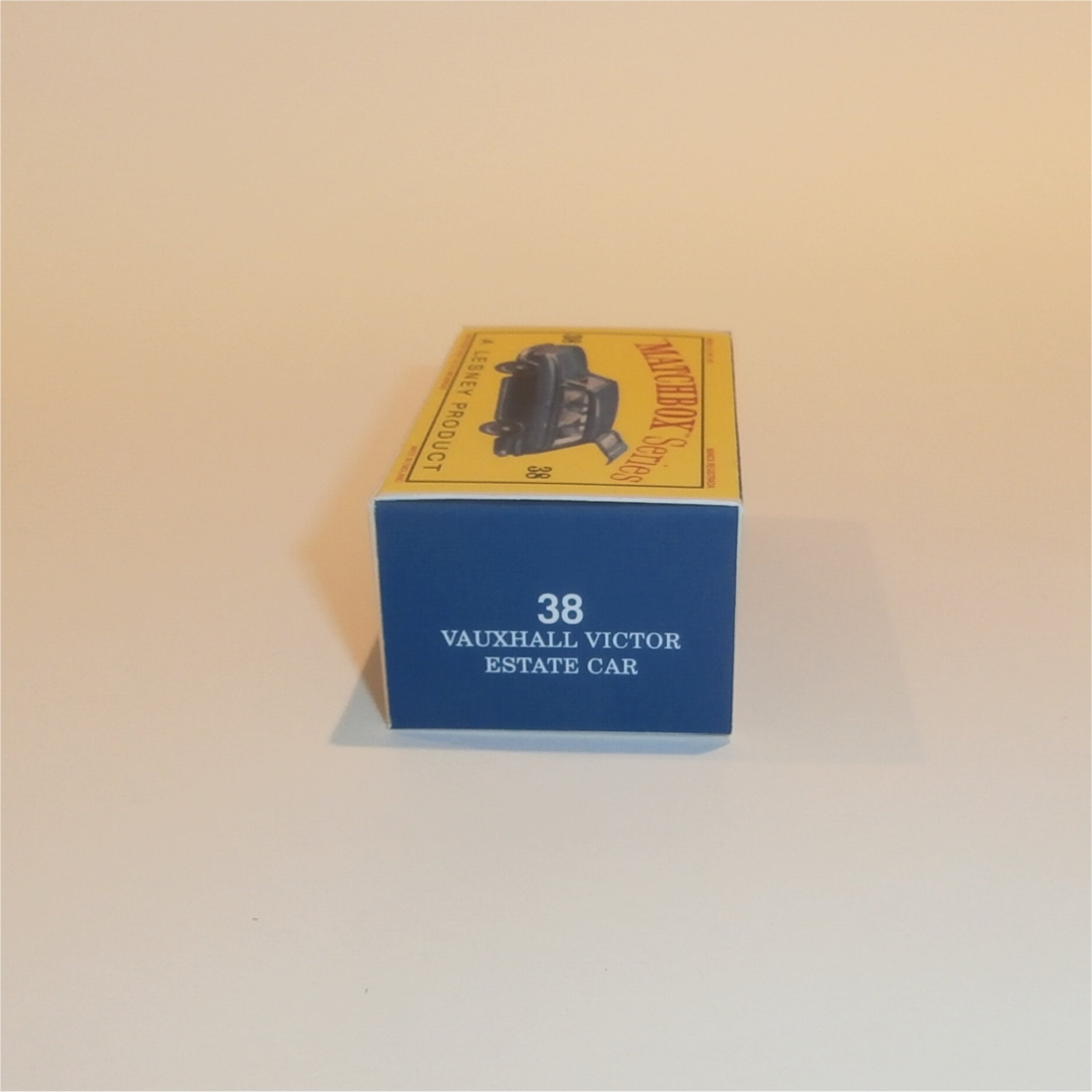 An empty reproduction Matchbox Lesney 38 b Vauxhall Victor Estate Empty D Style Repro Box.