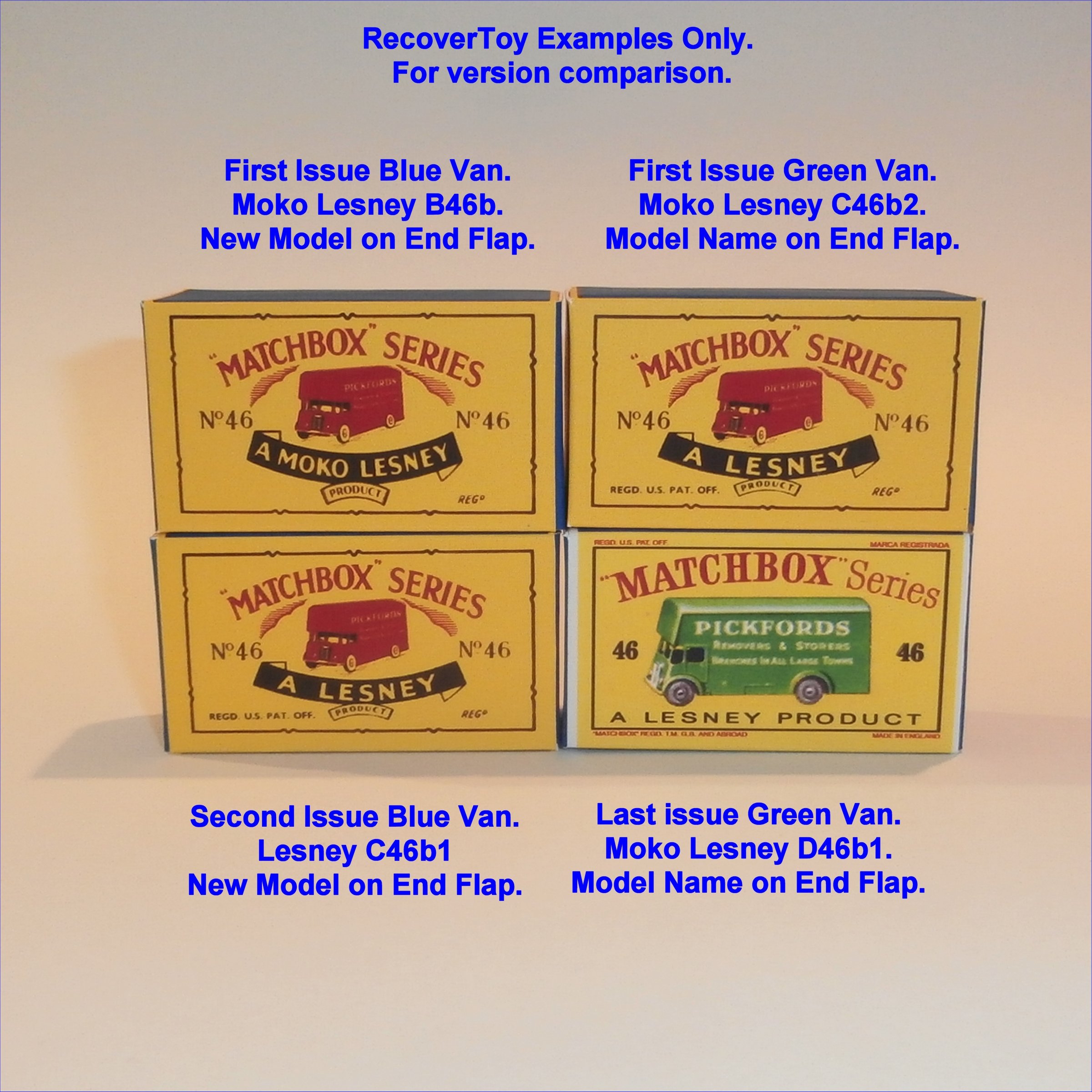 The other boxes are referenced as B46b for the blue van with ‘New Model’ and then C46b1 the same but as a Lesney issue. The first issue for the green van is a C style box reference C46b2.