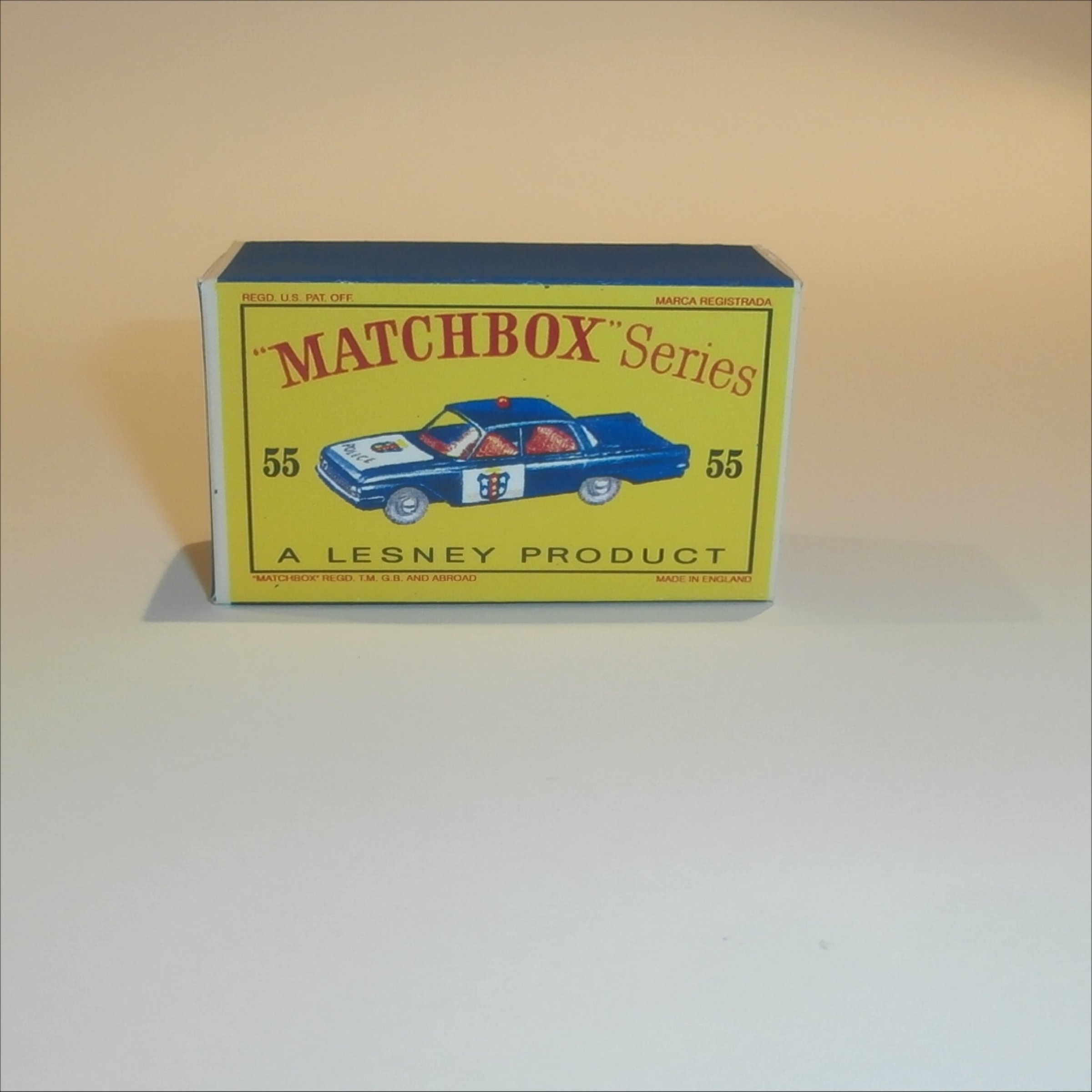 An empty reproduction Matchbox Lesney 55 b Ford Fairlane Police Car Empty D Style Repro Box.