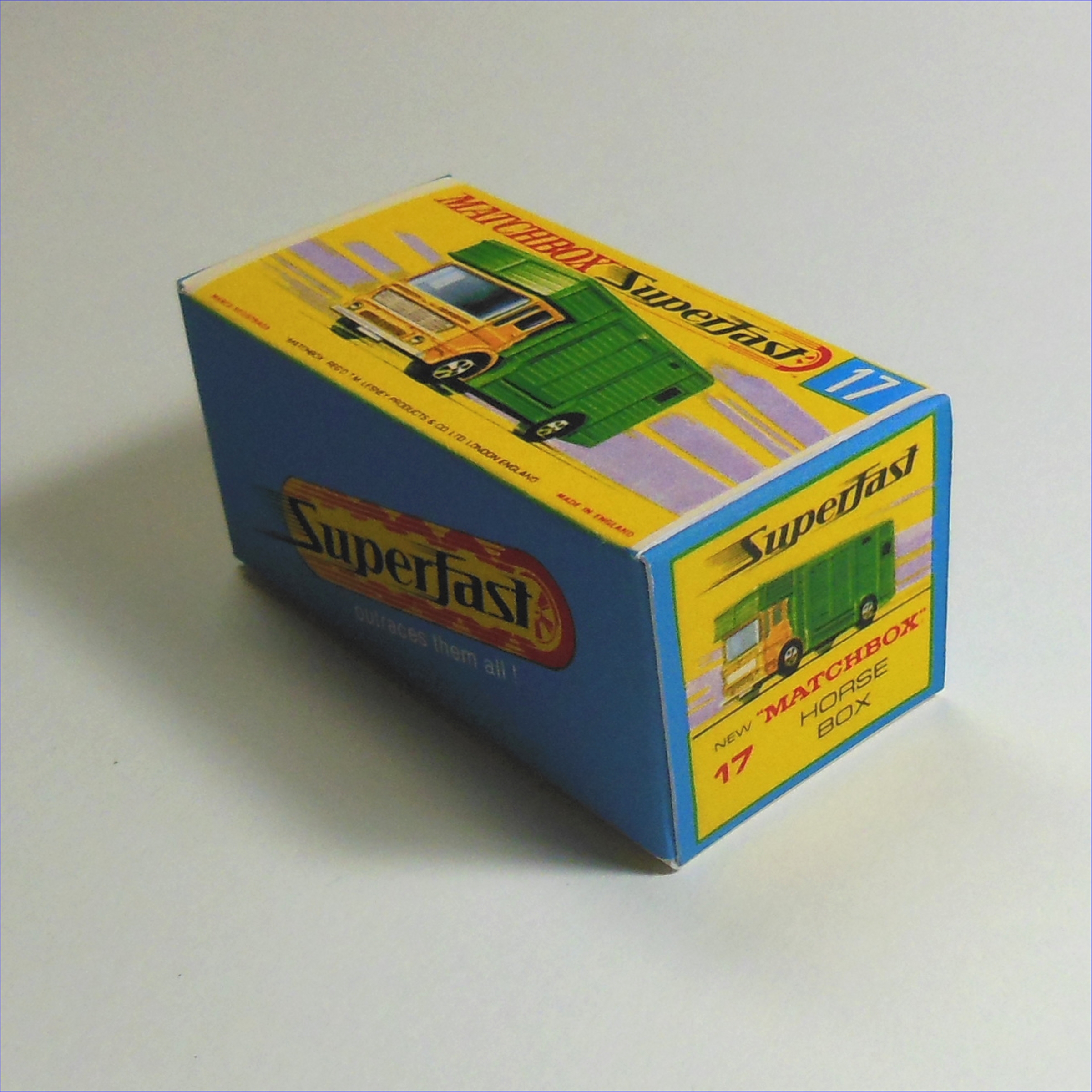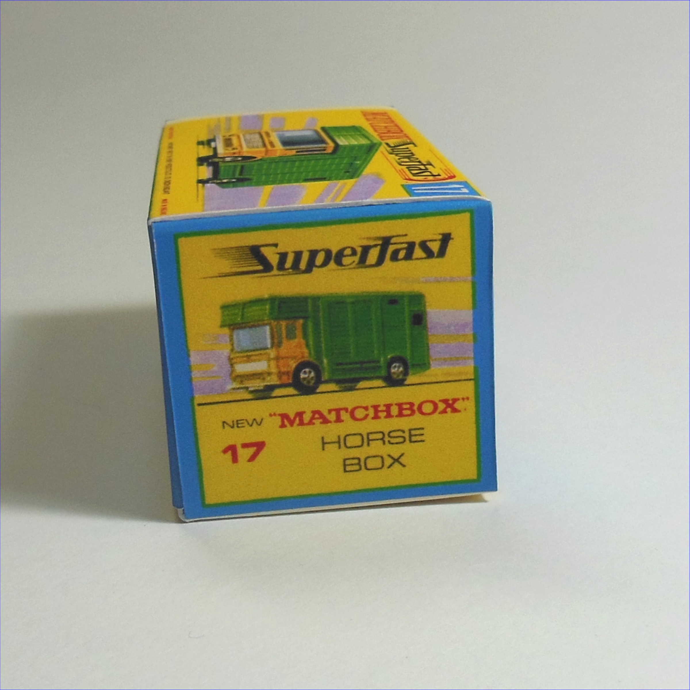 An empty reproduction replacement box for a Matchbox Lesney Superfast 17e AEC Horse Box G Style Repro Box.