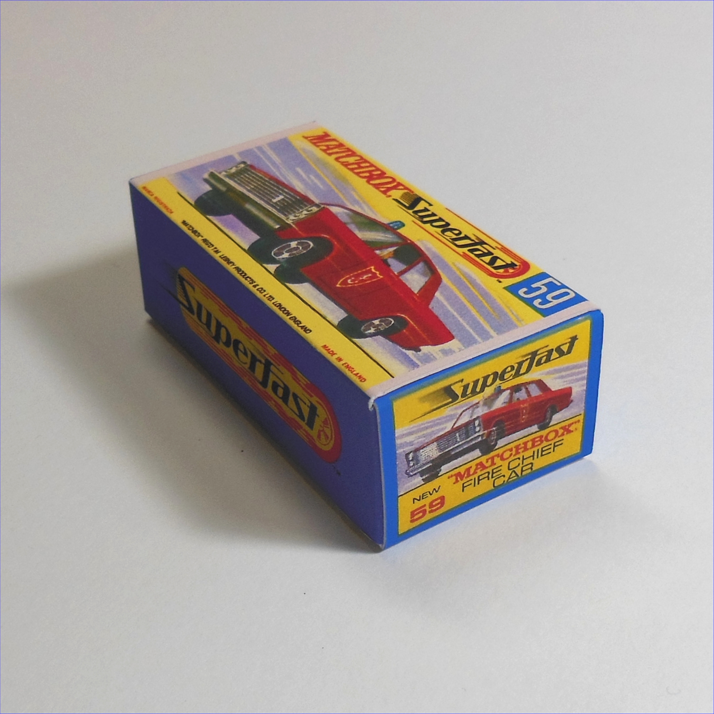 An empty reproduction replacement box for a Matchbox Lesney Superfast 59d Ford Galaxie Fire Chief G Style Repro Box.